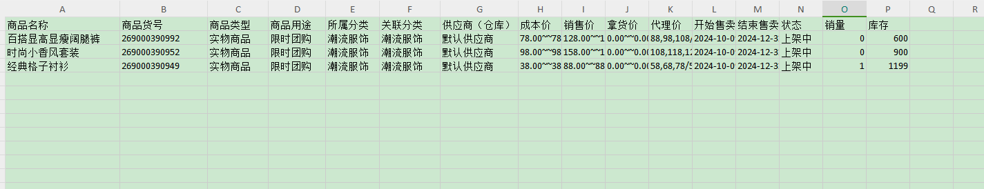 目录 搜索 展开 系统介绍管理端-PC首页看板店铺主题装修风格一商品专辑商品自营商品收单易商品商品分类品牌管理商品标签运费模板供应商仓库管理购买须知素材中心导出历史记录订单自营订单收单易订单收单易备货记录收单易异常订单视频号订单视频号异常订单备货记录导出记录快递单导入记录售后代理/用户 申请售后流程项目方后台申请售后流程售后列表售后地址管理导出历史记录用户代理列表注册用户考核准代理考核记录加盟审核黑/白名单导入用户导入用户历史操作日志财务用户奖金代理提现提现记录运营资金视频号资金池预存款审核预存款收单易账单直播视频号直播小程序直播播播熊直播小店带货机构机构商品机构分配达人佣金商家分配达人佣金合作商家商品合作内容合作合作达人商品合作内容合作合作品牌订单管理推客带货直播间短视频推客管理基础配置营销工具等级设置佣金设置系统设置视频号小店(微信小店)视频号分享营销商品类限时秒杀限时团购店铺类服务标签公告管理banner管理工具类优惠券积分中心活跃值排行榜跨境保税满包邮分享有礼积分兑换弹窗广告满减满送满赠日历签到购买有礼注册有礼储值有礼换购平台服务退换无忧补贴标准权限员工管理角色管理数据业绩统计商品统计设置项目设置代理关系平台展业分享设置代理设置代理须知设置升/降级设置商品设置订单设置售后设置客服设置奖金设置基础奖金单品团队奖团队业绩奖代理提现设置(独立版)项目方提现设置独立版提现非独立版提现加盟商品页设置操作日志管理端-小程序订单管理商品管理代理余额运营资金奖金支出所有代理订单网络同级网络推荐网络加盟审核代理排行榜预存款选品中心小程序直播退换无忧代理端-小程序我的订单奖金团队业绩工具 暂无相关搜索结果! view_count:69 本文档使用 MinDoc 发布 导出历史记录 导出历史记录:主要是导出商品表格的明细记录导出表格格式如下:作者:admin 创建时间:2024-08-07 11:38最后编辑:admin 更新时间:2026-03-31 17:07