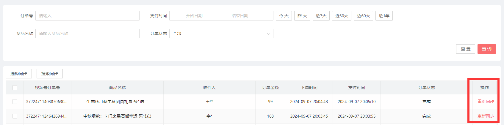 视频号异常订单:通常是指商品提审到视频号(微信小店)那边,商品库存不足,或者直接在视频号(微信小店)修改增加商品规格等信息导致订单产生后,订单就会出现在视频号异常订单列表。如果是商品库存不足的话,增加库存后,点击“重新同步” 即可 点击“重新同步” 后,该订单就会正常在视频号订单列表显示了作者:admin 创建时间:2024-08-09 18:30最后编辑:admin 更新时间:2026-03-31 17:07