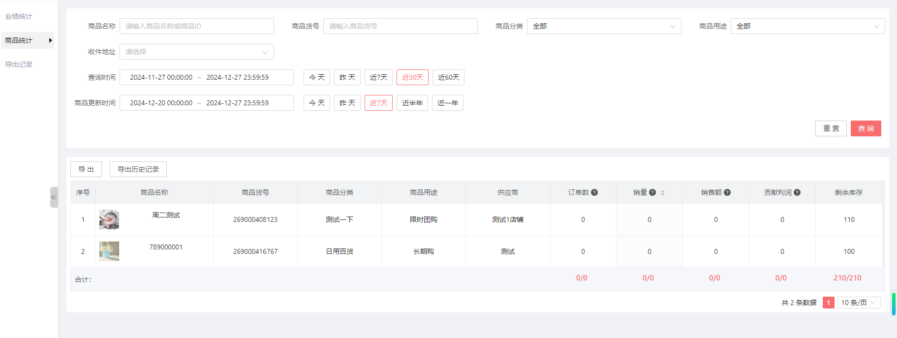 目录 搜索 展开 系统介绍管理端-PC首页看板店铺主题装修风格一商品专辑商品自营商品收单易商品商品分类品牌管理商品标签运费模板供应商仓库管理购买须知素材中心导出历史记录订单自营订单收单易订单收单易备货记录收单易异常订单视频号订单视频号异常订单备货记录导出记录快递单导入记录售后代理/用户 申请售后流程项目方后台申请售后流程售后列表售后地址管理导出历史记录用户代理列表注册用户考核准代理考核记录加盟审核黑/白名单导入用户导入用户历史操作日志财务用户奖金代理提现提现记录运营资金视频号资金池预存款审核预存款收单易账单直播视频号直播小程序直播播播熊直播小店带货机构机构商品机构分配达人佣金商家分配达人佣金合作商家商品合作内容合作合作达人商品合作内容合作合作品牌订单管理推客带货直播间短视频推客管理基础配置营销工具等级设置佣金设置系统设置视频号小店(微信小店)视频号分享营销商品类限时秒杀限时团购店铺类服务标签公告管理banner管理工具类优惠券积分中心活跃值排行榜跨境保税满包邮分享有礼积分兑换弹窗广告满减满送满赠日历签到购买有礼注册有礼储值有礼换购平台服务退换无忧补贴标准权限员工管理角色管理数据业绩统计商品统计设置项目设置代理关系平台展业分享设置代理设置代理须知设置升/降级设置商品设置订单设置售后设置客服设置奖金设置基础奖金单品团队奖团队业绩奖代理提现设置(独立版)项目方提现设置独立版提现非独立版提现加盟商品页设置操作日志管理端-小程序订单管理商品管理代理余额运营资金奖金支出所有代理订单网络同级网络推荐网络加盟审核代理排行榜预存款选品中心小程序直播退换无忧代理端-小程序我的订单奖金团队业绩工具 暂无相关搜索结果! view_count:36 本文档使用 MinDoc 发布 商品统计 商品统计:主要统计商品的订单数,销量,以及销售额等数据。订单数:销量:销售额:贡献利润:剩余库存:作者:admin 创建时间:2024-12-05 16:38最后编辑:admin 更新时间:2026-03-31 17:07