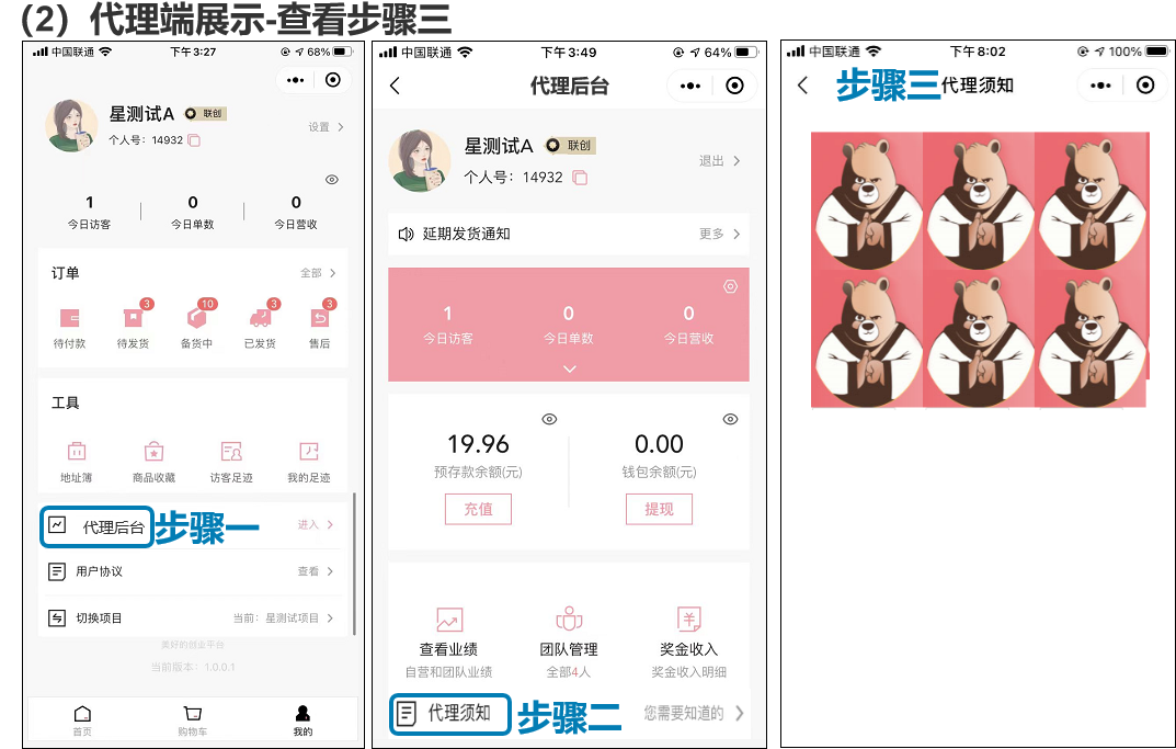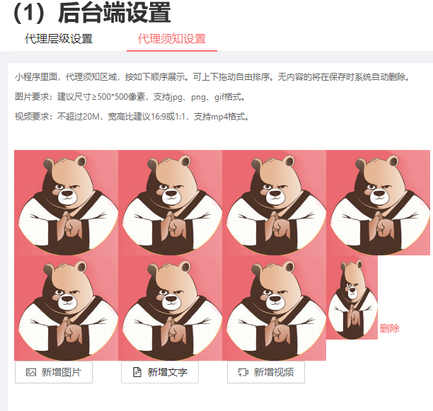 目录 搜索 展开 系统介绍管理端-PC首页看板店铺主题装修风格一商品专辑商品自营商品收单易商品商品分类品牌管理商品标签运费模板供应商仓库管理购买须知素材中心导出历史记录订单自营订单收单易订单收单易备货记录收单易异常订单视频号订单视频号异常订单备货记录导出记录快递单导入记录售后代理/用户 申请售后流程项目方后台申请售后流程售后列表售后地址管理导出历史记录用户代理列表注册用户考核准代理考核记录加盟审核黑/白名单导入用户导入用户历史操作日志财务用户奖金代理提现提现记录运营资金视频号资金池预存款审核预存款收单易账单直播视频号直播小程序直播播播熊直播小店带货机构机构商品机构分配达人佣金商家分配达人佣金合作商家商品合作内容合作合作达人商品合作内容合作合作品牌订单管理推客带货直播间短视频推客管理基础配置营销工具等级设置佣金设置系统设置视频号小店(微信小店)视频号分享营销商品类限时秒杀限时团购店铺类服务标签公告管理banner管理工具类优惠券积分中心活跃值排行榜跨境保税满包邮分享有礼积分兑换弹窗广告满减满送满赠日历签到购买有礼注册有礼储值有礼换购平台服务退换无忧补贴标准权限员工管理角色管理数据业绩统计商品统计设置项目设置代理关系平台展业分享设置代理设置代理须知设置升/降级设置商品设置订单设置售后设置客服设置奖金设置基础奖金单品团队奖团队业绩奖代理提现设置(独立版)项目方提现设置独立版提现非独立版提现加盟商品页设置操作日志管理端-小程序订单管理商品管理代理余额运营资金奖金支出所有代理订单网络同级网络推荐网络加盟审核代理排行榜预存款选品中心小程序直播退换无忧代理端-小程序我的订单奖金团队业绩工具 暂无相关搜索结果! view_count:27 本文档使用 MinDoc 发布 代理须知设置 代理须知设置二、代理须知设置1、图文说明 2、编辑说明(1)支持编辑、新增、删除图片、视频、文字(2)建议尺寸和要求上传图片:建议尺寸≥500*500像素,支持JPG、PNG、GIF格式视频要求:不超过20M,宽高比16:9或者1:1,支持MP4格式作者:admin 创建时间:2025-05-21 15:33最后编辑:admin 更新时间:2026-03-31 17:07