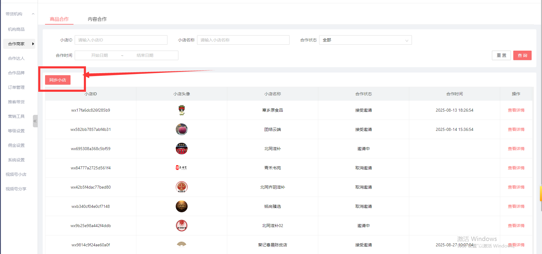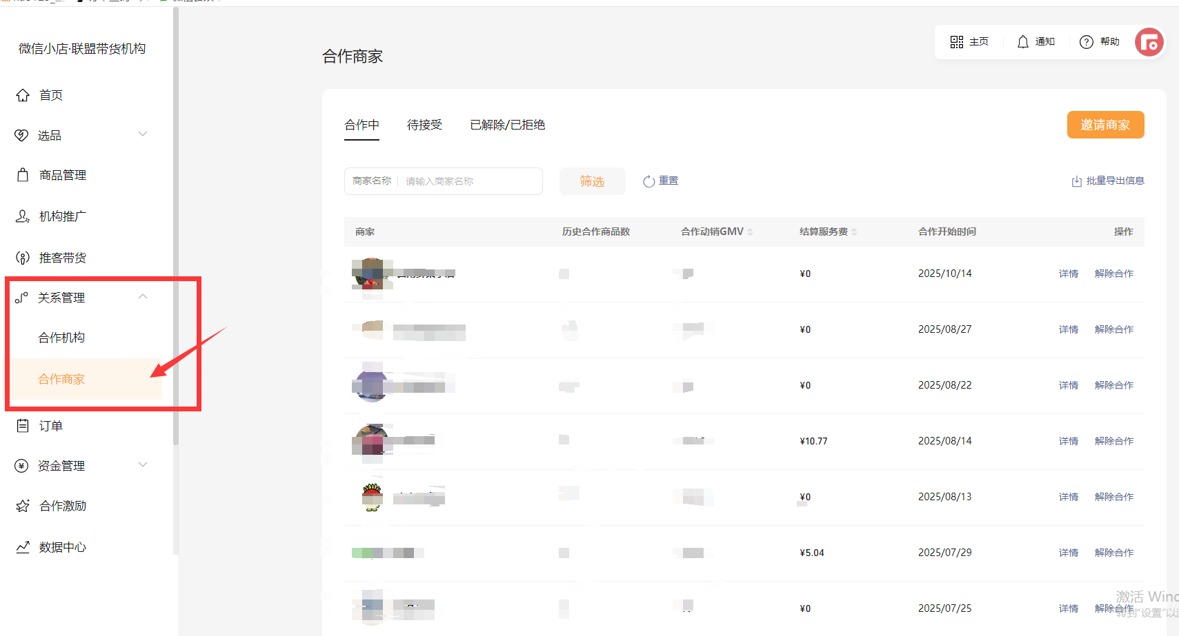 商品合作:主要是有商品合作的商家,具体可以在联盟带货机构后台,关系管理-合作商家具体查看,截图如下: 温馨提示:当已经接受邀请合作后,尤其是已经选品,商品已经上架后,在商品合作这里,需要重新点击一下同步小店作者:admin 创建时间:2025-07-30 11:36最后编辑:admin 更新时间:2026-03-31 17:07