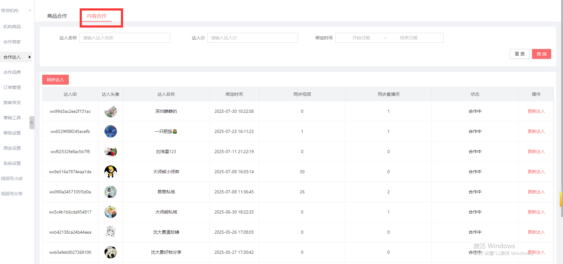 内容合作:邀请达人进行内容合作,即接口拉取达人的带货内容(包括视频号直播间、短视频)并分发给合作推客。就是在联盟带货机构后台-推客带货-内容合作后,就会在该列表显示作者:admin 创建时间:2025-10-16 18:21最后编辑:admin 更新时间:2026-03-31 17:07