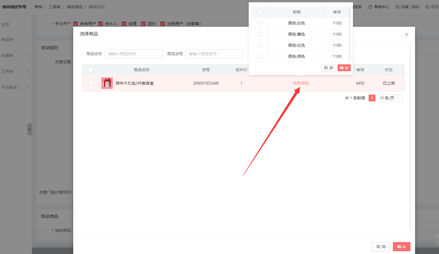 点击“选择规格” 就会弹出该商品的所有规格,然后勾选规格确定,勾选商品,确定即可
