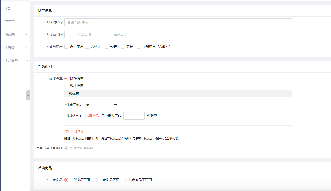 阶梯满送:即满XX元,赠送什么商品(选择赠送商品最多可以选10种),最多可以增加到五级,每增加一级,优惠的金额,会比上一个级别高,以此类推。具体截图如下: