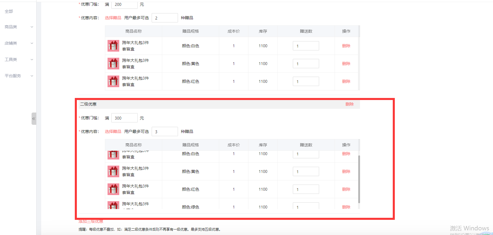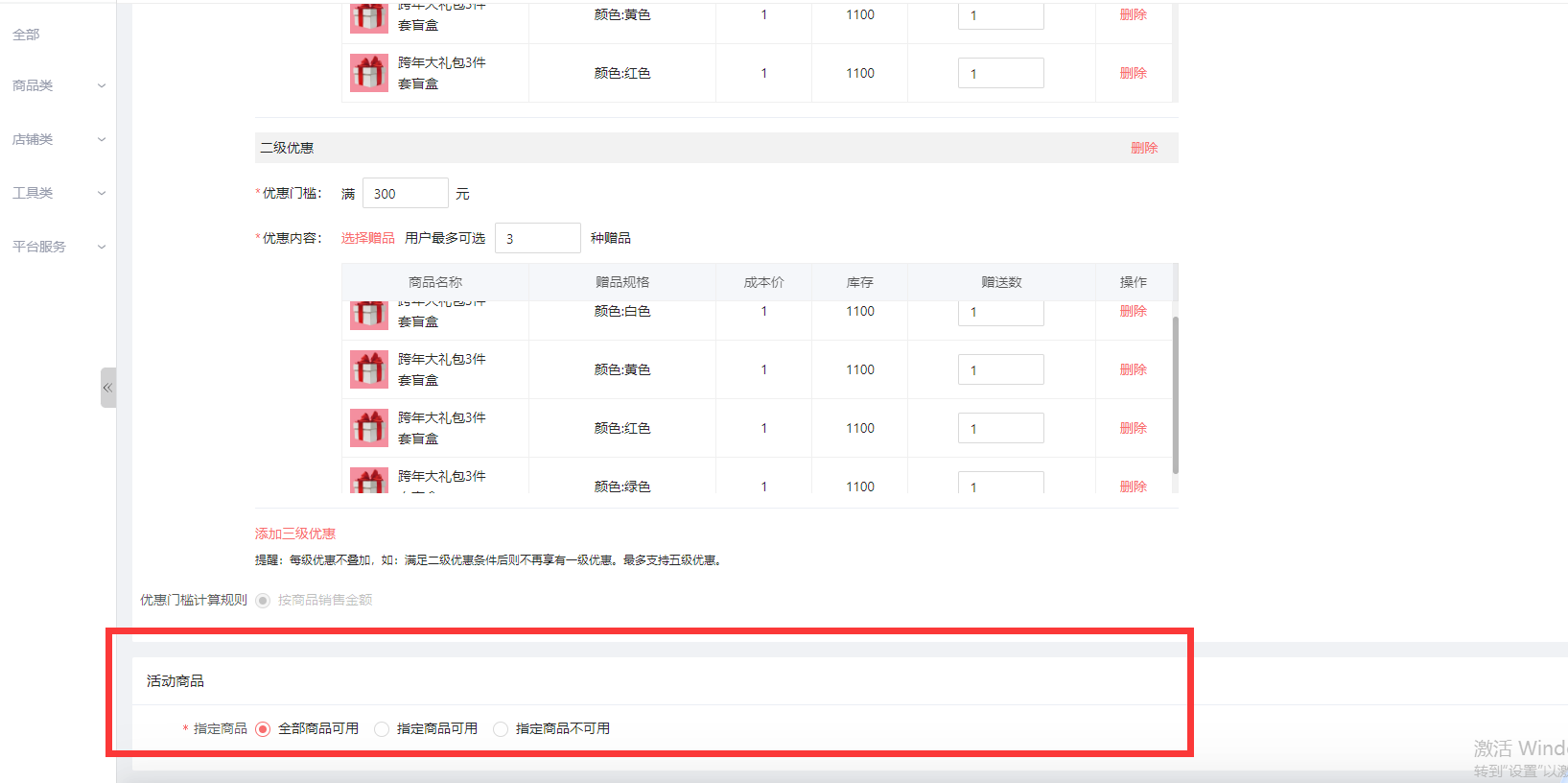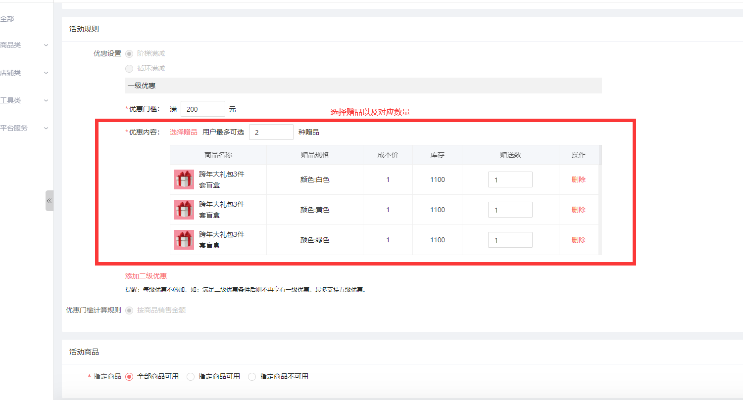 具体截图如下:举例选择:阶梯满送,第一级 满200元,赠送2种,第二级,满300元,赠送3种
