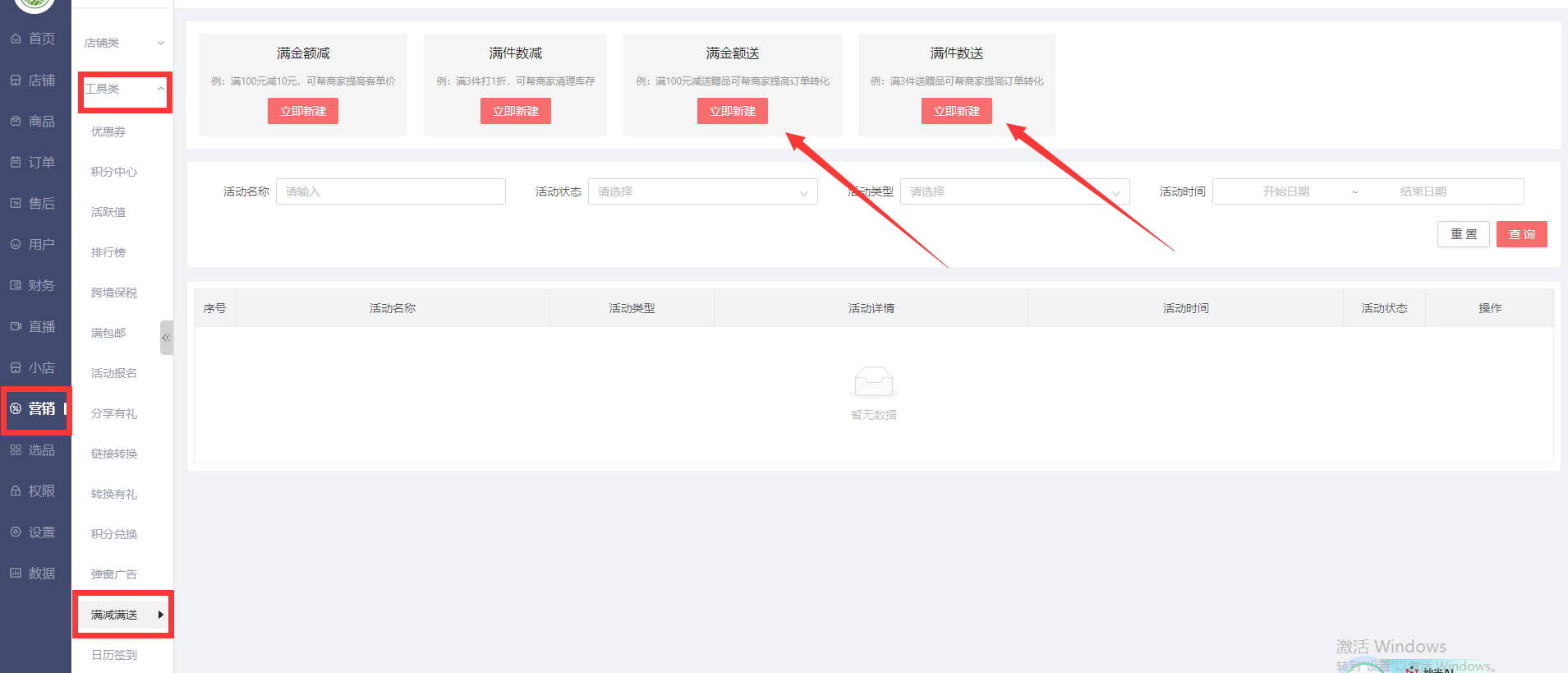 1.后台设置活动:PC端-营销-工具类-满减满送,还有两种:满金额送和满件数送