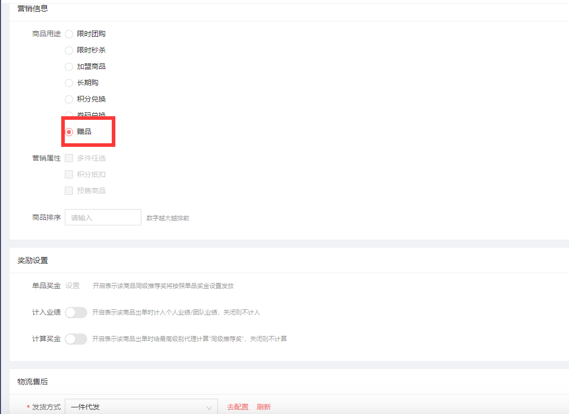 新增商品,在营销信息-商品用途那,勾选赠品,开启赠品后,该商品的业绩,奖金,以及售后等信息,默认都关闭。注:赠品是不计算奖金,业绩,也无法申请售后的。