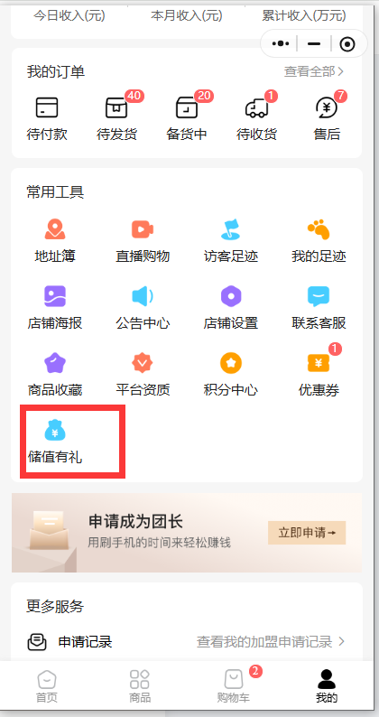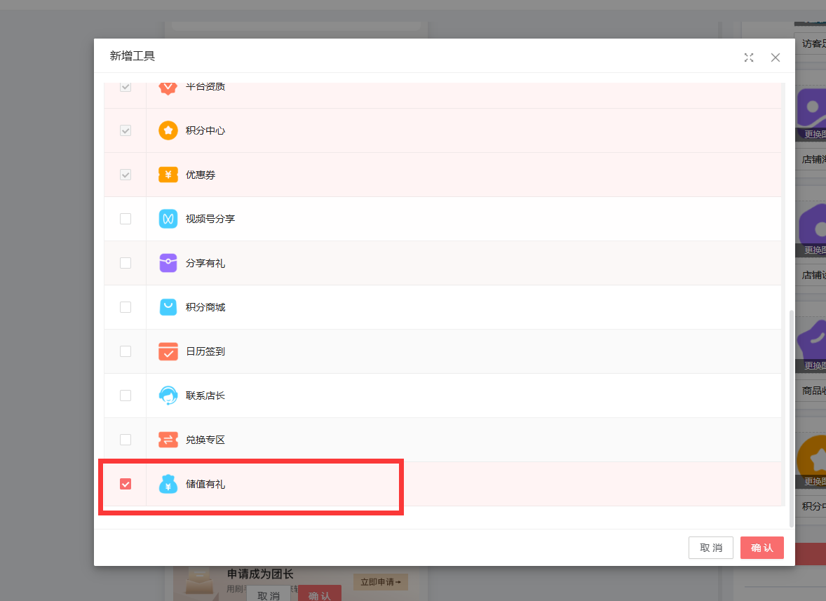 上面信息设置好后,需要在PC 端-店铺-主体装修-在用的风格模板,配置-我的页面-常用工具,新增工具-开启储值有礼