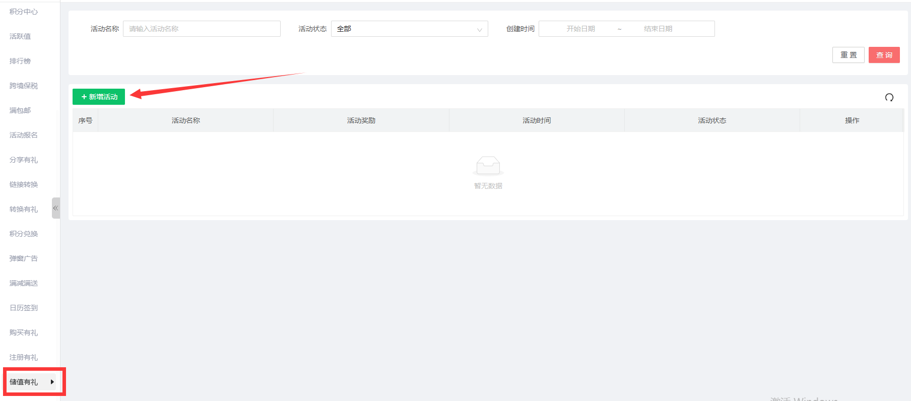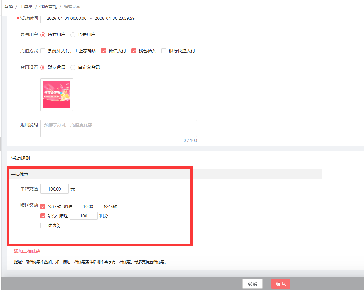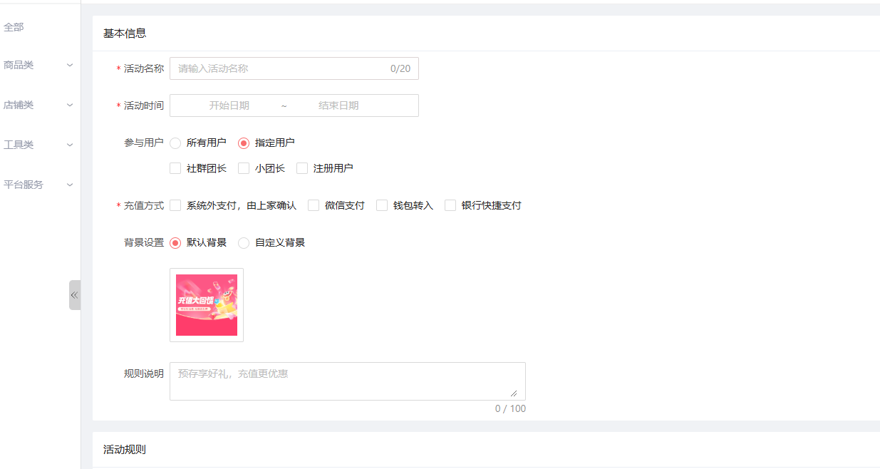 在PC 端后台-营销-工具类-储值有礼: 新增活动