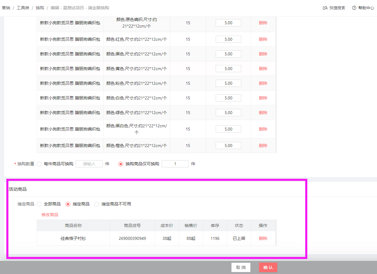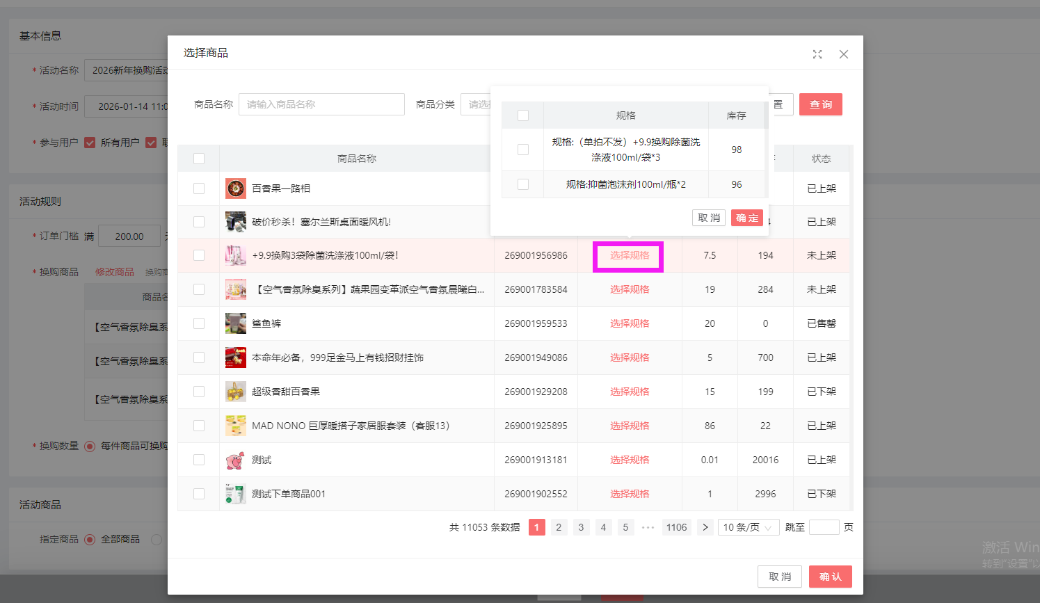 商品选择这里,可以选单规格商品,多规格商品,多规格的商品还可以选具体的规格,以及未上架的商品(如换购的商品还没有上架的话,用户提交订单就无法看到具体的换购商品)。