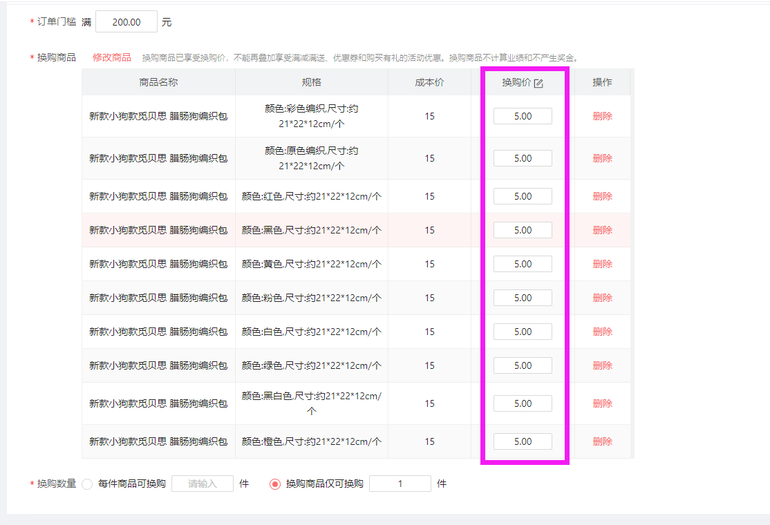 设置活动规则:订单门槛,举例满200元,就可以参与换购