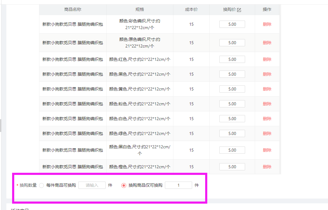 2.换购商品这里,最多10个商品,可以是10个单规格商品,也可以是1个商品的10个规格的,还可以是混合的,最多支持选择10个。