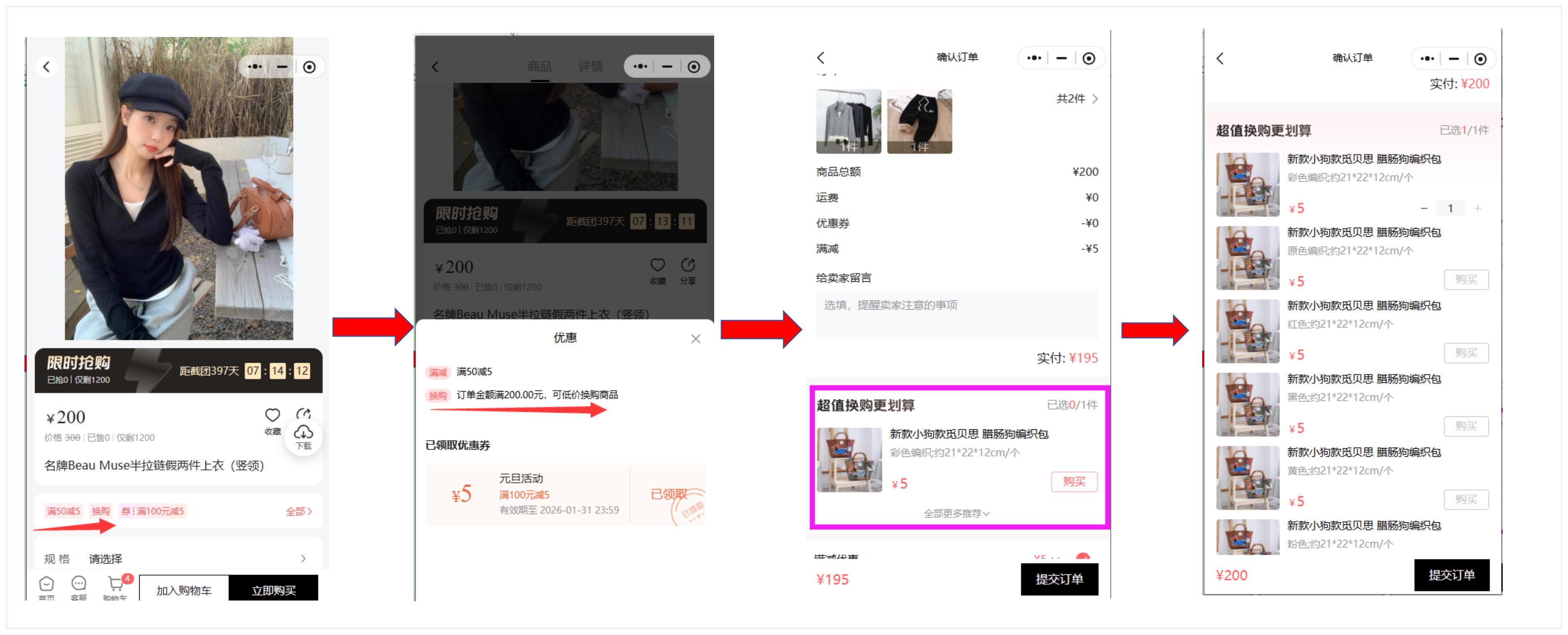 温馨提示:换购商品的显示,以及选择,一定是在提交确定订单页面才会看到和选择的哦